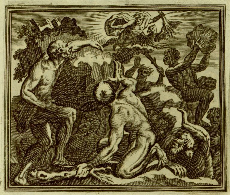 Vzbouření Giganti metají balvany a kusy skal, někteří drží kyje. Na nebi Zeus (Iuppiter) s orlem a blesky.