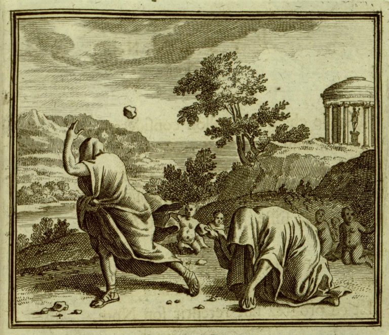 Deukalión a Pyrrha zahalení v pláštích za sebe házejí kameny, z kterých vznikají lidé. V pozadí chrám se sochou bohyně Themis, kterou Deukalión a Pyrrha prosili, dále vodní plocha po potopě a krajina.