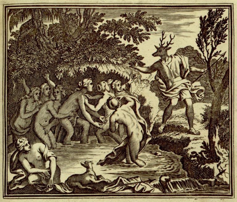 Počínající proměna Aktaióna v jelena. Artemis (Diana) se svou družinou je překvapená při koupeli, od rukou bohyně naznačené kouzlo proměny. Skupina nymf se poplašeně odvrací od Aktaióna. Jedna z nymf vystupuje na břeh, odpočívající pes, kopí s látkou v popředí.