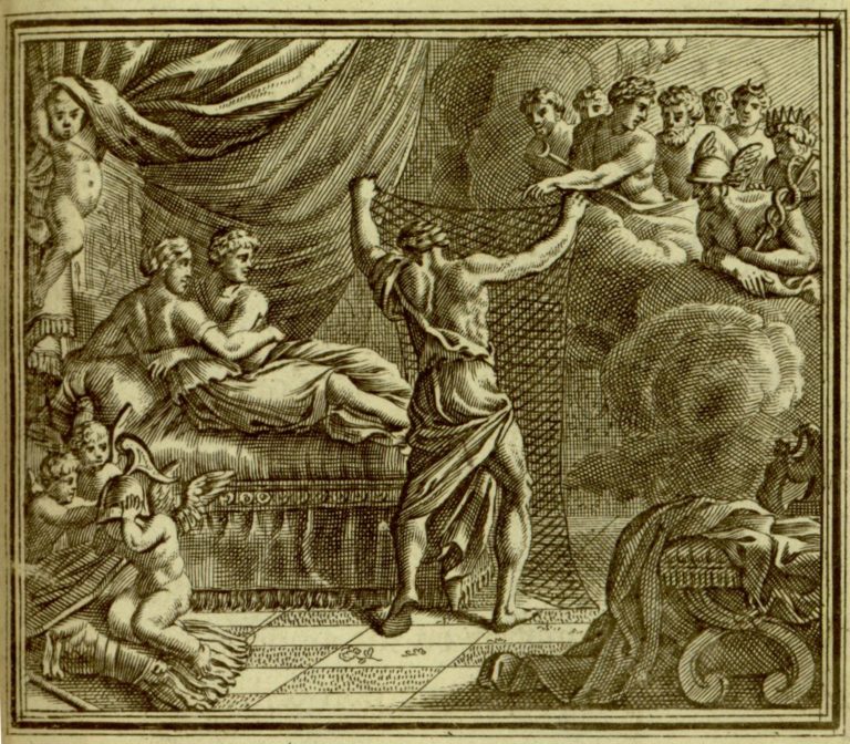 Hefáistos (Vulkán) se sítí stojí před loží, na které jsou přistižení milenci Afrodíté (Venuše) a Arés (Mars). Z oblaku přihlížejí olympští bohové – Apollón, Hermés (Mercurius; Merkur), Artemis (Diana), Zeus (Iuppiter) atd. U lože si okřídlení putti hrají se zbrojí. Jeden puttó odkrývá baldachýn lože.