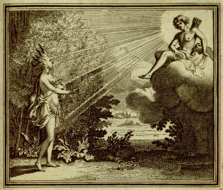 Rozcuchaná a ztrápená Klytié, sužovaná neopětovanou láskou a zalitá slunečními paprsky, se stane květinou (otočník nebo čekanka?). Na oblaku sedí a dívá se jinam Apollón.