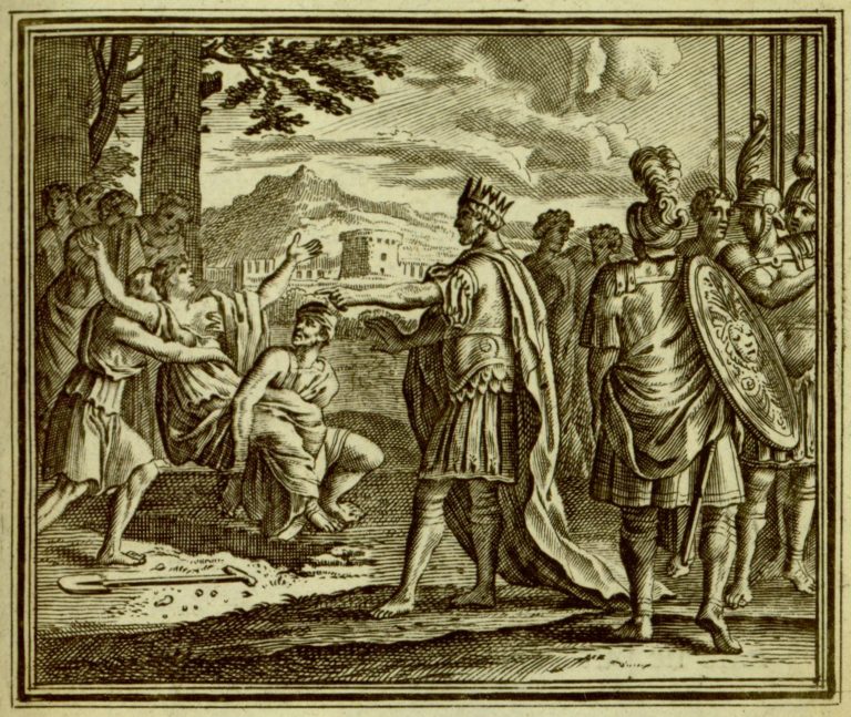 Král Orchamos nechává zaživa zakopat svou dceru Leukothou, jako trest za milenecký poměr s Apollónem. Uprostřed král Orchamos ukazuje na Leukothou, kterou drží služebníci nad vykopanou dírou v zemi, vedle leží rýč. U krále stojí skupina vojáků, za Leukothou přihlížející ženy. V pozadí jsou vyobrazeny hradby a krajina s horami. Apollón později promění Leukothou ve stejnojmenný keř.