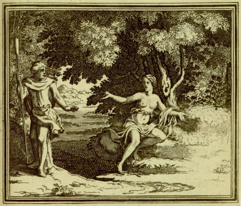 Odmítnutá nymfa trestá pastýře Dafnida proměnou ve skálu.