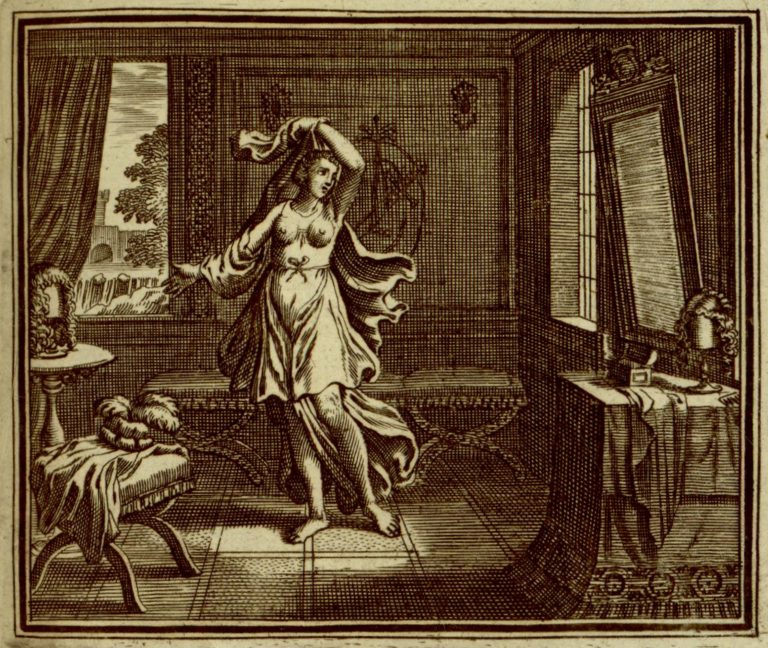 Síthón (Síthán) v pokoji před zrcadlem v podobě ženy. V pokoji na stolcích jsou paruky, na židli klobouk s pláštěm, na zdi zavěšený meč, za oknem je vidět krajina.