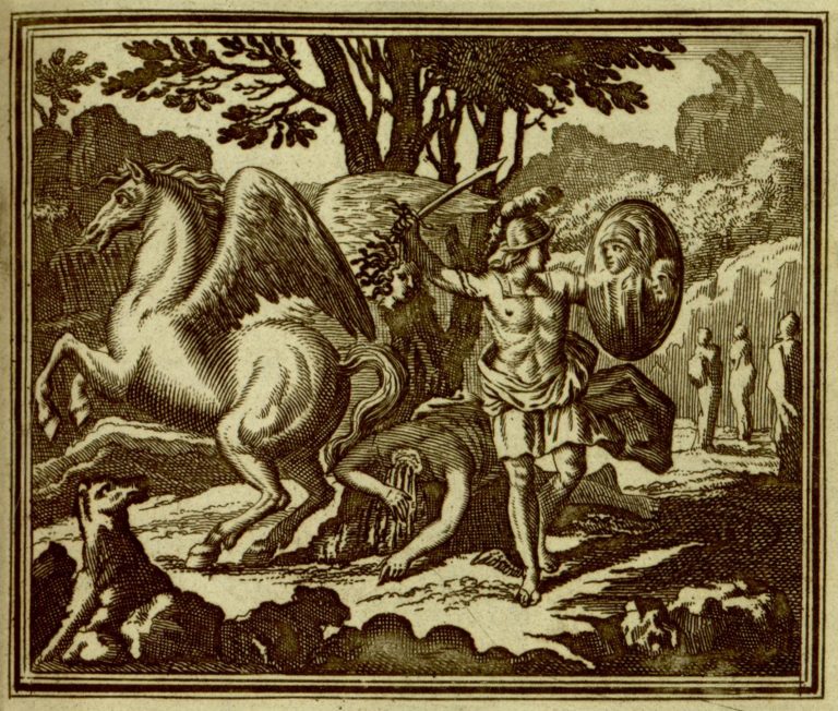 Perseus drží v jedné ruce meč a uťatou Medúsinu hlavu, v druhé ruce štít, ve kterém se odráží jeho obličej a hlava Medúsy. Po levé straně stojí na zadních okřídlený kůň Pégasos. Za nimi prýští krev z těla bez hlavy. V pozadí zkamenělé postavy. Výjev je zasazen do krajiny.