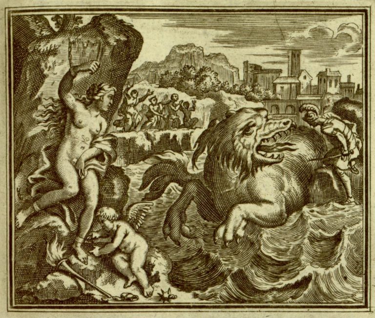 Na moři Perseus zápasí s mořským netvorem. Na levé straně Andromeda přikovaná ke skále sleduje Perseův zápas. Amorek (Erós; Cupido) se snaží osvobodit Andromedinu nohu z okovu, na zemi leží hořící pochodeň a lastury. V pozadí přihlížejí diváci, za nimi město a pohoří.