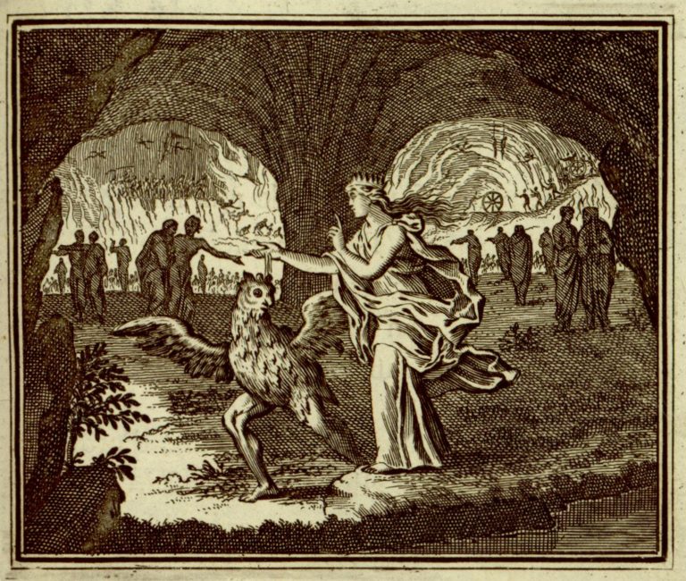 V podsvětí u břehu řeky Persefoné (Proserpina) trestá Askalafa proměnou ve výra – polévá ho vodou podsvětní řeky a gestem naznačuje, že měl mlčet. V pozadí výjevy podsvětních trestů. Askalafos udal, co viděl, že bohyně snědla zrnka granátového jablka.