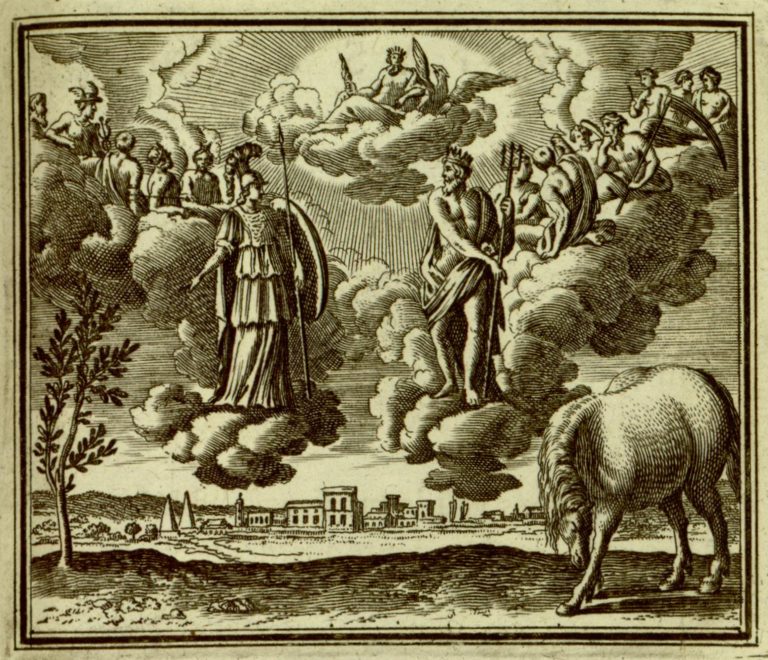 Spor mezi Athénou (Minerva) a Poseidónem (Neptun) o vládu nad Attikou a právo pojmenovat město. Na straně Athény její dar, na který poukazuje – stromek olivy, Poseidón ukazuje na pasoucího se koně. V oblacích je okolo Dia (Iuppiter) je shromážděn nejvyšší olympský pantheon, který rozhoduje o tom, který dar lidem je cennější. V pozadí stavby města – Athény.
