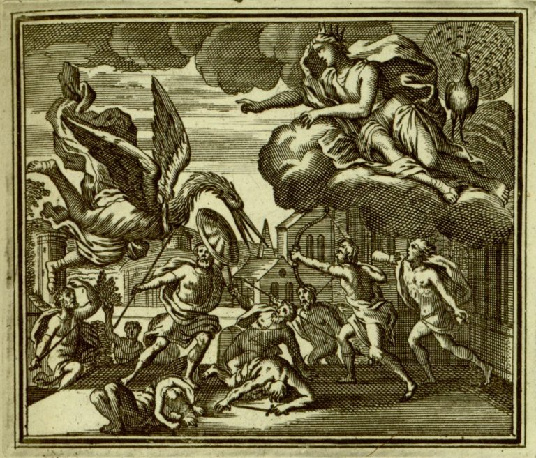 Na oblaku Héra (Juno; Iuno) s pávem trestá Geranu proměnou v jestřába. Na napůl proměněnou Geranu útočí její lid – Pygmejové, na zemi leží postavy. Okolo jsou domy a paláce města.