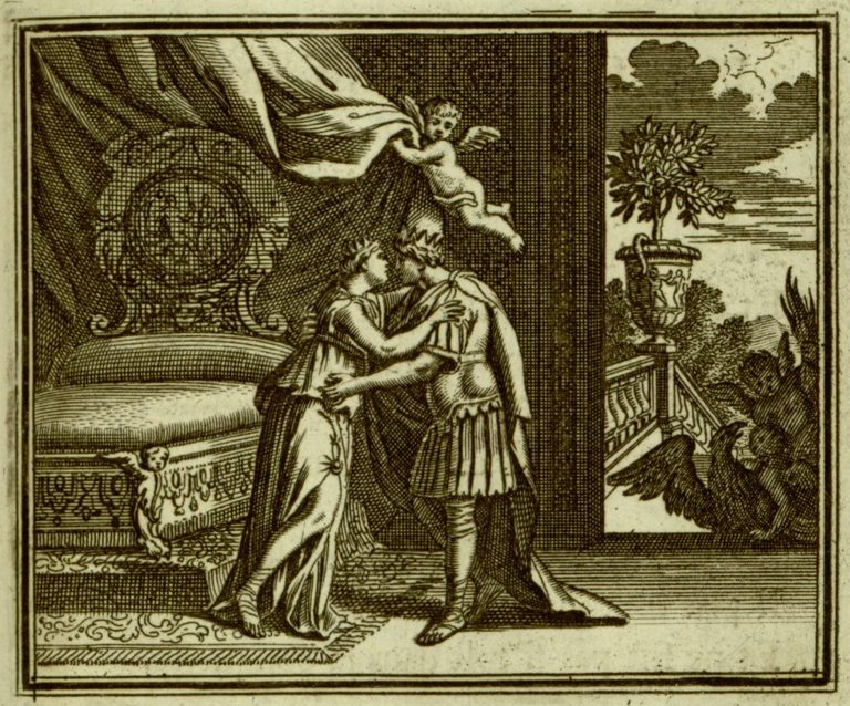 Zeus (Iuppiter) v podobě krále Amfitryóna se objímá s Alkménou v ložnici, naznačen polibek. Nad nimi malý Erós (Amor; Cupido) přidržuje baldachýn. V pozadí u vchodu orel a okřídlení putti, jeden z nich drží blesky, na schodišti váza se stromkem, krajina.