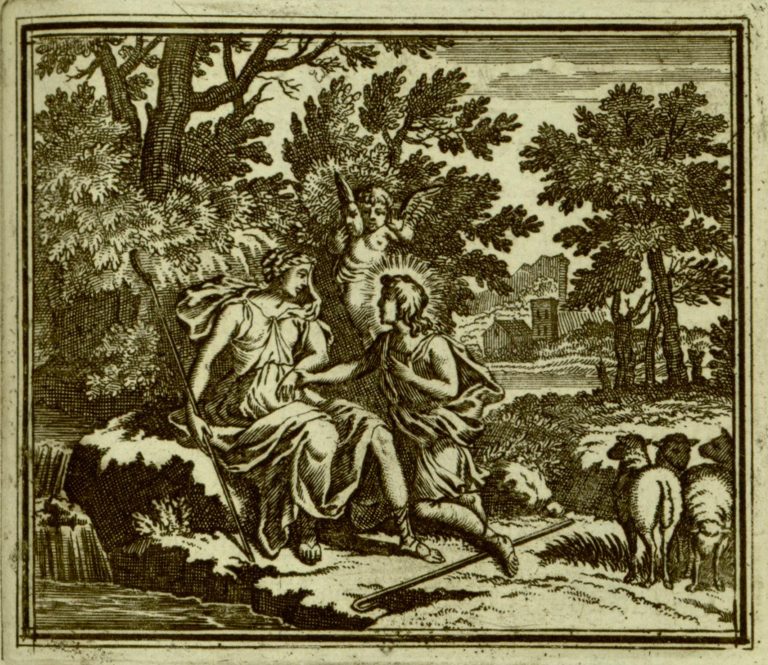 Apollón v podobě pastýře klečí a dvoří se Isse. Issé sedí u potoka s pastýřskou holí v ruce, druhá pastýřská hůl leží pod Apollónem, napravo malé stádo ovcí. Nad Apollónem se vznáší Amorek (Erós; Cupido), v ruce drží masku. Výjev je situován do krajiny, v pozadí stavby.