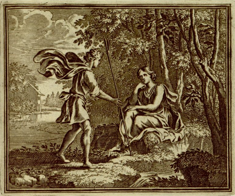 V krajině stojí Zeus (Iuppiter) jako pastýř s holí a vlajícím pláštěm před sedící Mnémosyné. V pozadí nalevo dům.