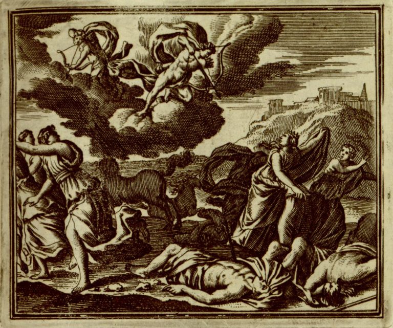Z oblaku střílí Artemis (Diana) a Apollón na prchající děti Niobé pod nimi. Mezi nimi splašení koně a královna Niobé se marně snaží ukrýt pod pláštěm dceru. V pozadí na kopci je opevnění a palác. Niobé se promění v kámen.