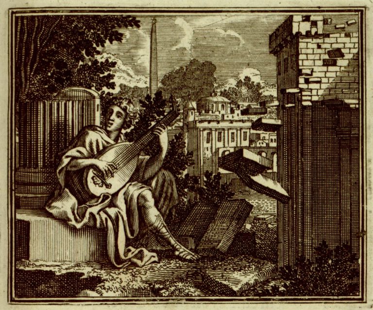 Amfíón hraje na loutnu a písní se staví hradby – kameny se ukládají na svá místa ve zdi. V pozadí stavby města.