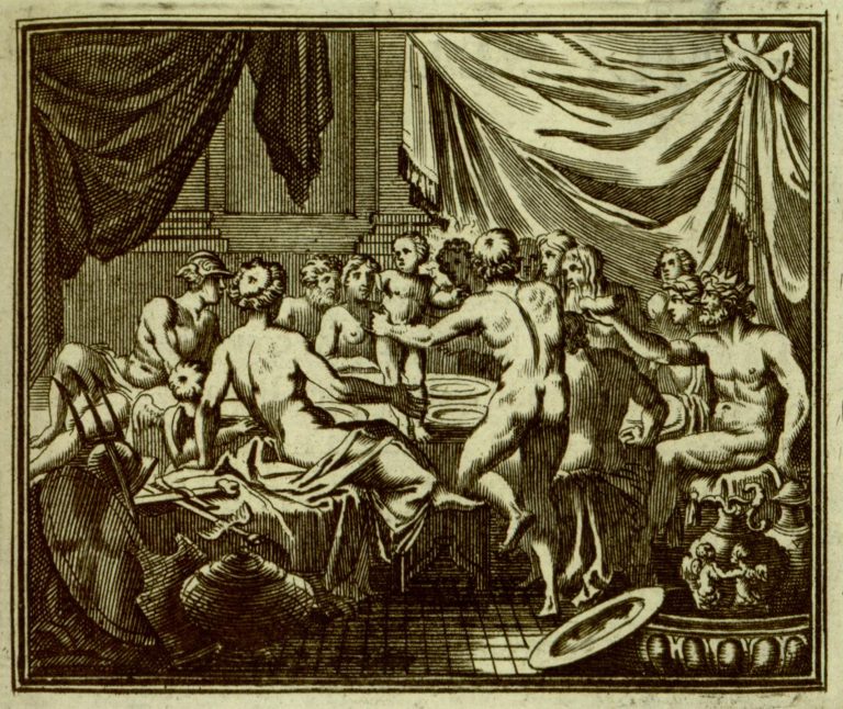 Bohové a bohyně shromážděni na hostině kolem stolu dávají dohromady rozřezané tělo Tantalova syna Pelopa, aby ho oživili. Výjev se odehrává v interiéru paláce, na stropě jsou látky, okolo bohů nádoby a jejich atributy.