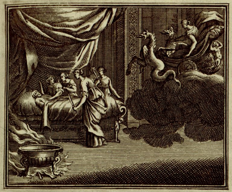 Interiér ložnice – král Peliás leží na loži, které obklopují jeho dcery s noži. Médeia sedí v dračím voze na oblaku. Na zemi je ohniště a kotlík.