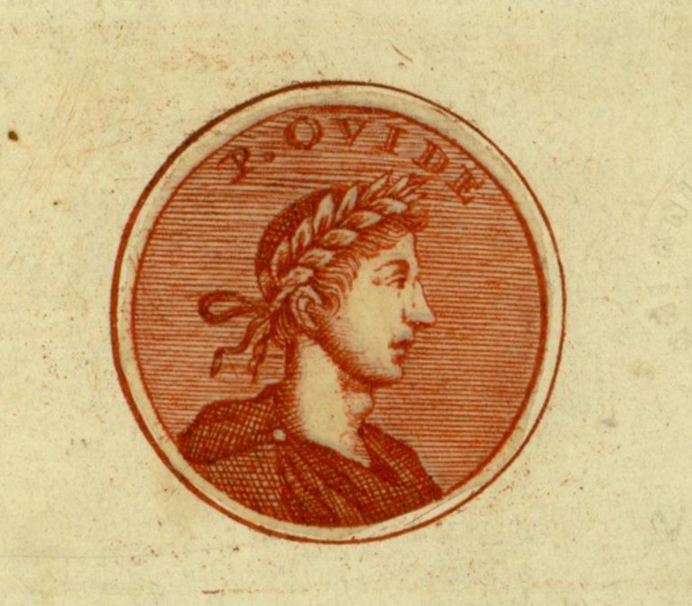 V medailonu Ovidiův portrét z profilu s nápisem P. OVIDE.