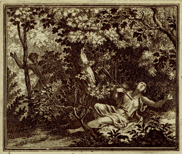 V lese umírá Prokrida zasažená šípem (kopím). Kefalos (Cephalus) se pohybuje za křovím.