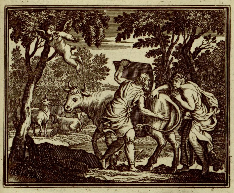 Daidalos (Daedalus) ukazuje královně Pásifaé (Pasiphae) dřevěnou krávu, otevírá poklop, aby si do ní mohla vlézt. Nad nimi odvracející se malý Erós (Amor; Cupido), v pozadí posvátný bílý býk a stádo skotu.