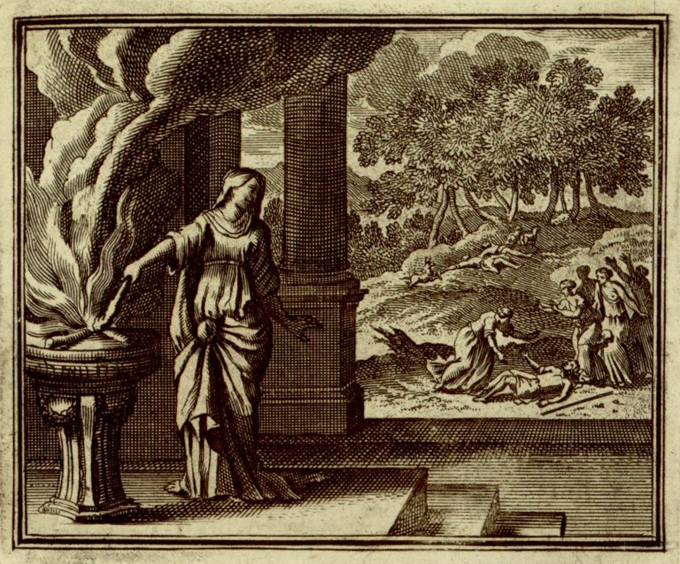 V popředí v paláci Althaia z pomsty přikládá poleno života Meleagra na oheň a otáčí se směrem k výjevu: v krajině, obklopený sestrami, umírá Meleagros. Některé ze sester budou Artemidou (Diana) proměněny v perličky. Opodál leží zavraždění Pléxippos a Toxeus, u jejich těl jsou pravděpodobně psi. Meleagros je zabil kvůli sporu při lovu kalydónského kance.