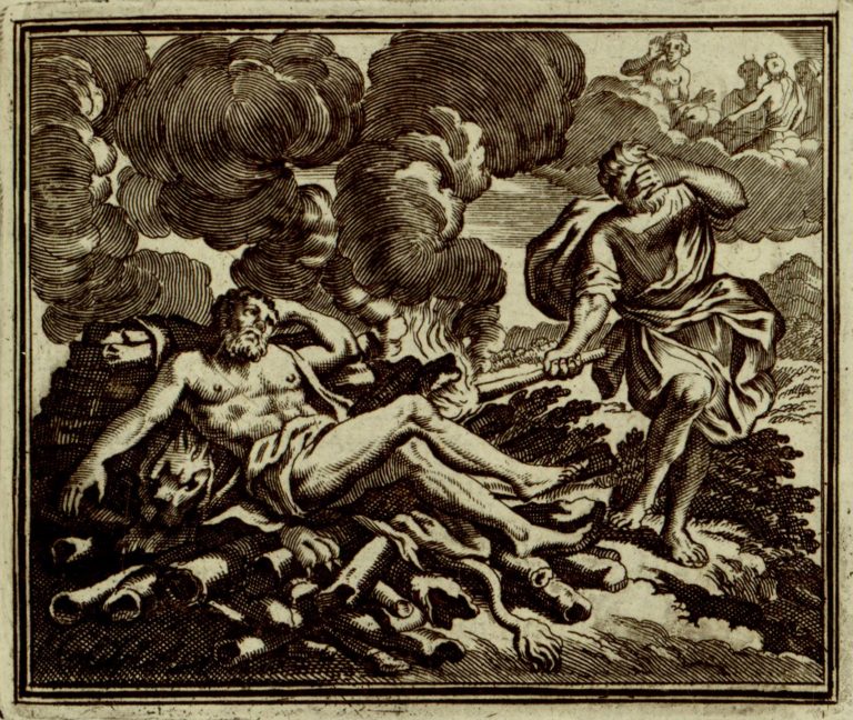 Filoktétés (Philoctetes) podpaluje pohřební hranici s umírajícím Héraklem (Hercules). Napravo nahoře jsou v oblaku olympští bohové a bohyně – chystá se Héraklova apoteóza.