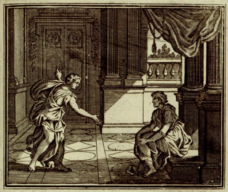 Galanthis lstí odlákává Eileithyiu (Lucina), která sedí se zkříženýma nohama a rukama na schodu mezi sloupy a zabraňuje tak Alkméninu porodu Hérakla (Hercules). Výjev se odehrává na chodbě před dveřmi, na podlaze je dlažba. Galanthis bude potrestána proměnou v lasičku.
