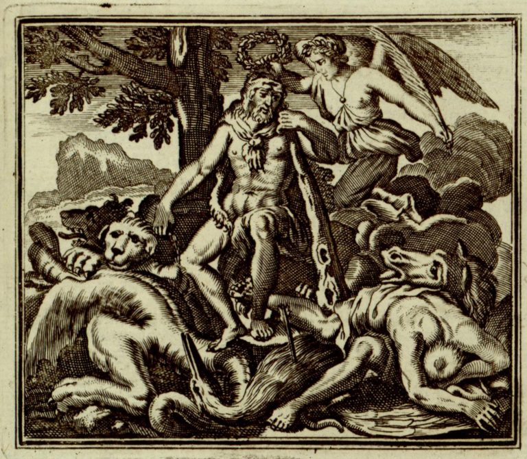 Gloria (Sláva) korunuje Hérakla (Hercules) vavřínovým věncem. Héraklés (Hercules) se opírá o svůj kyj a v druhé ruce drží na řetězu Kerbera, nohou stojí na mrtvé Hydře. Na zemi leží mrtvé tělo Dioméda, jeho sluhy a koně, uprostřed šípem zastřelený orel – Periklymenos. Za Héraklem stojí strom, v pozadí krajina.