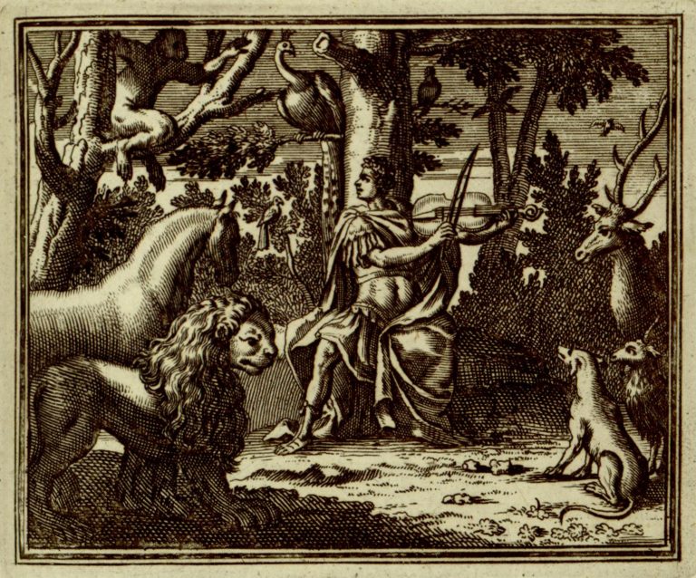 V krajině pod stromem sedí Orfeus a hraje na housle. Okolo naslouchají zvířata (kůň, lev, pes, koza, jelen, na větvích sedí ptáci, páv, opice), rostliny i kameny.