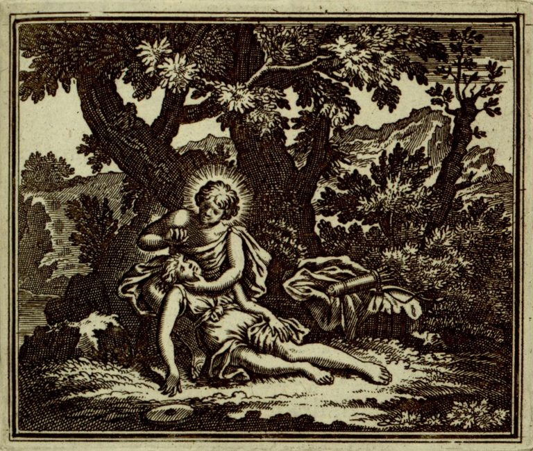 U vzrostlého stromu sedí Apollón, Hyakinthos mu umírá na klíně. Na zemi leží disk, vedle luk a toulec s šípy.