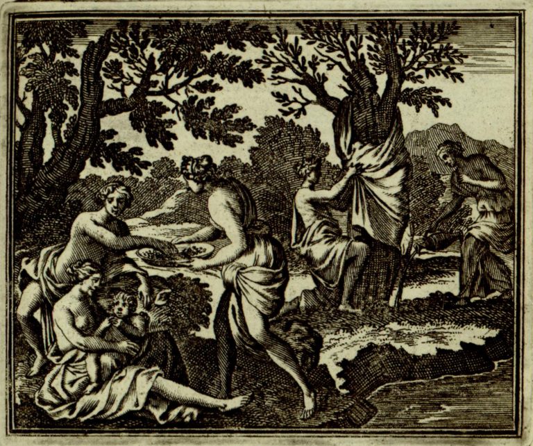 V levém rohu se najády starají o narozeného Adónida, opečovávají ho s matčinými slzami, které jsou na tácu. Napravo je Myrrha proměněná ve strom v péči Eileithyie (Lucina) a najády, která ho zalévá ze džbánu.