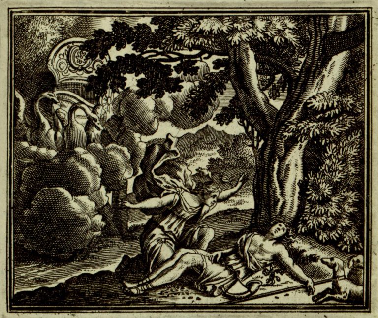 Afrodíté (Venuše) s rozevlátým pláštěm se sklání nad mrtvým Adónidem pod stromem. Vedle těla roste květina, ve kterou se Adónis promění (pomněnka/sasanka/větruška). V pravém dolním rohu leží dva lovečtí psi, kopí a trubka. V levé horní části je na oblaku vůz tažený labutěmi, v pozadí krajina s kancem, kterého Adónis se psy lovil.