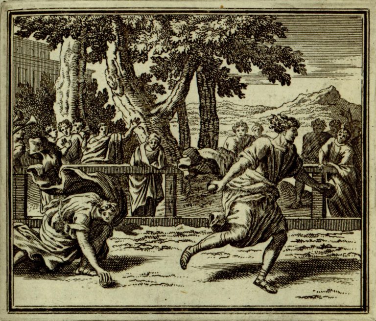 Závod v běhu: Hippomenés vede a v rukou drží dvě zlatá jablka. Za ním Atalanté sbírá ze země odhozené další zlaté jablko. Hippomenés dostal od Afrodíté (Venuše) zlatá jablka – díky nim vyhrál závod nad Atalantou. U tratě přihlížející diváci – muži a ženy, v pozadí palác.