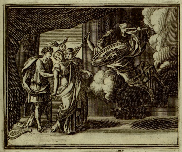 V pokoji Apollón a Hermés (Mercurius; Merkur) podpírají umírající Chioné (Khione), které rozzlobená Artemis (Diana) vrazila do srdce kopí. Na zemi leží Apollónova lyra. Artemis se vznáší na oblaku.