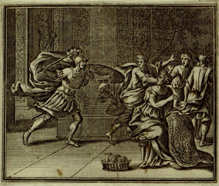 Odysseus (Ulixes) vyhání nápadníky z paláce, sedící Penelopa (Pénelopé) přihlíží s tkanou látkou na klíně, na zemi je košík s klubky nití.