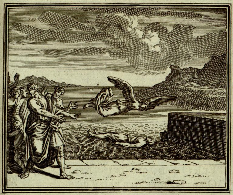 V popředí na břehu stojí rozrušený dav, na vlnách leží mrtvý Kéýx nad kterým se vznáší Alkyoné s křídly. Oba budou proměněni v ledňáčky.
