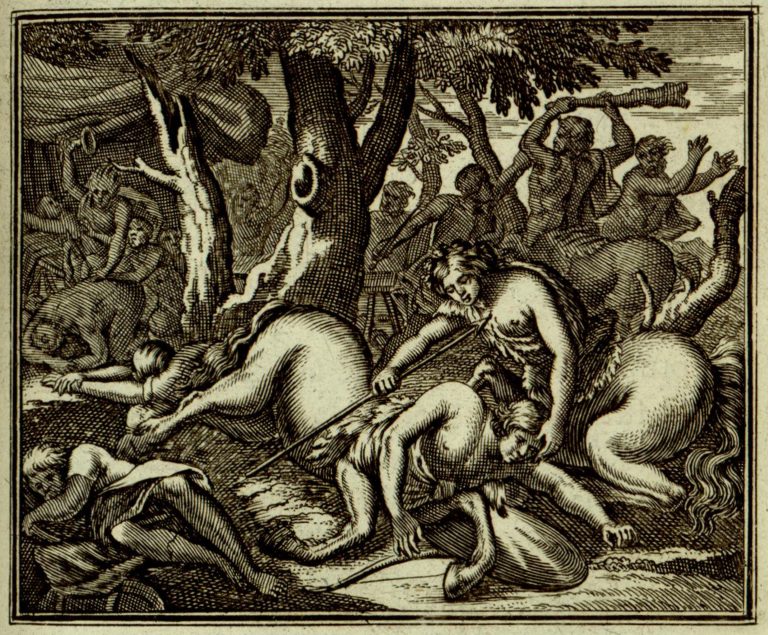 V popředí Hýlonomé obrací kopí, aby na něj nalehla, její mrtvý manžel Kylaros (Cyllarus) právě zemřel v jejím náručí. Okolo vřava bitvy Kentaurů a Lapithů.