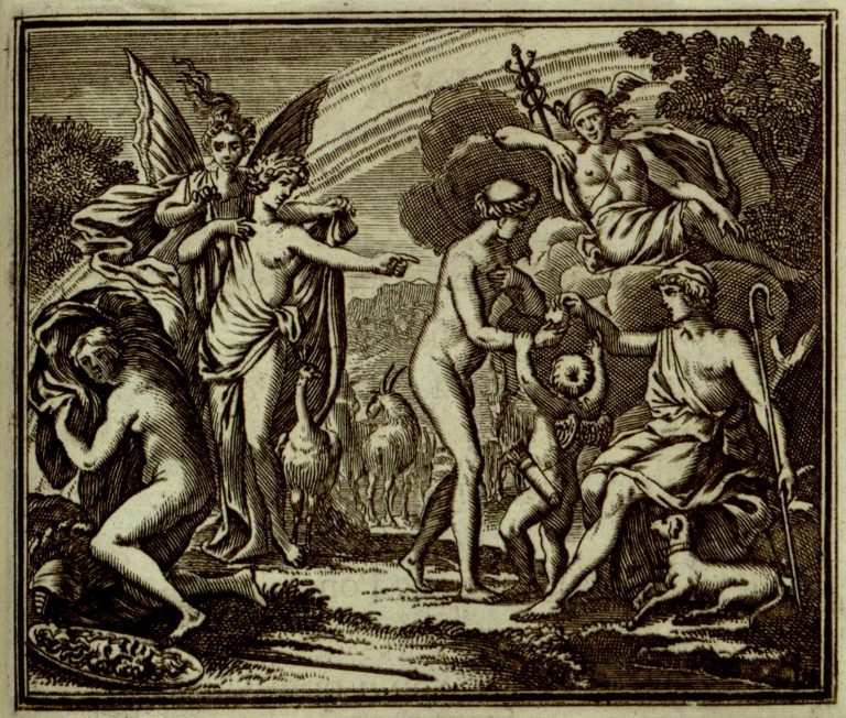 Vpravo pastýř Paris se psem u nohou, volí nejkrásnější bohyni a podává zlaté jablko Hesperidek Afrodítě (Venuše), malý Érós (Amorek; Cupido) ji drží za zápěstí a ukazuje na jablko. Na oblaku nad nimi se vznáší Hermés (Mercurius; Merkur). Vlevo se choulí Athéna (Minerva) s atributy u nohou, nad ní Héra (Iuno; Juno) se svým zvířetem – pávem – ukazuje na výjev, Eris, bohyně sváru, jí asistuje s pláštěm. Na nebi je duha, v pozadí stádo koz.